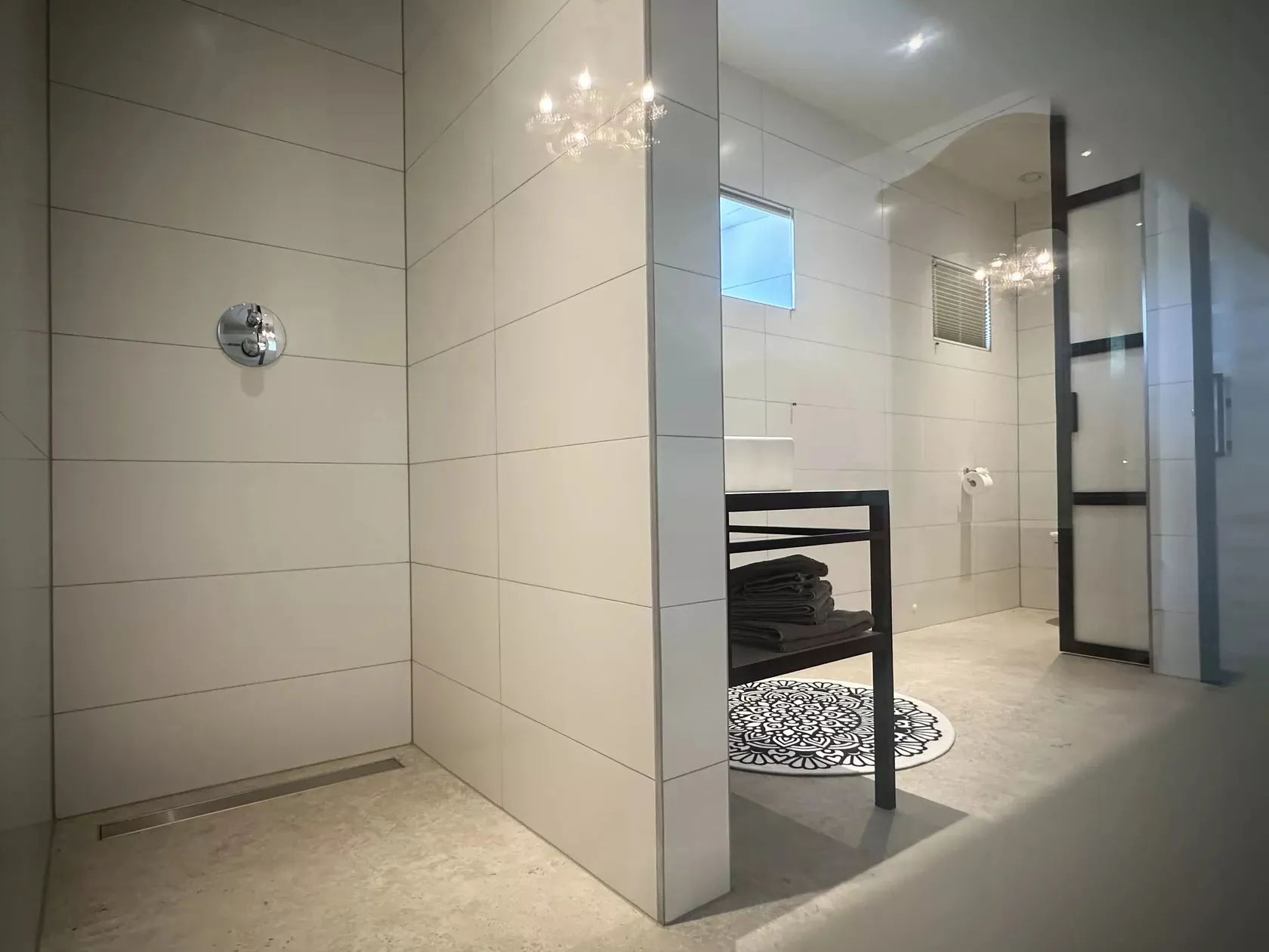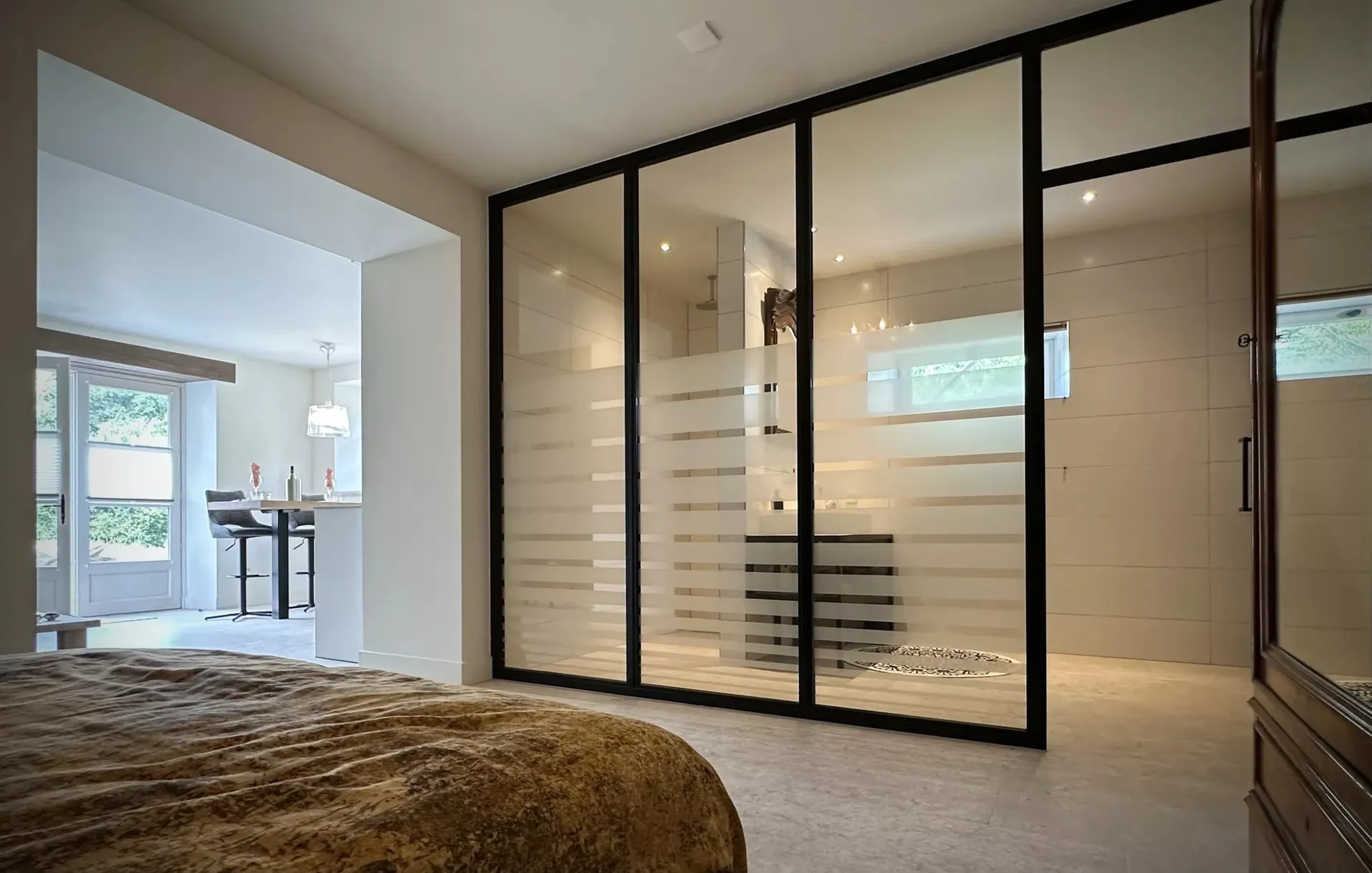 Derrière une paroi vitrée, nous avons créé une salle de bains avec douche, lavabo et toilettes.