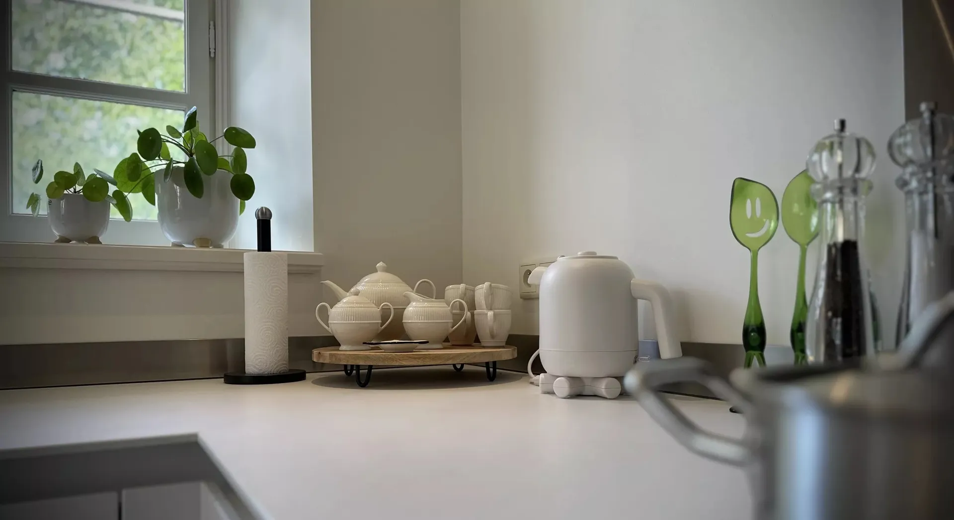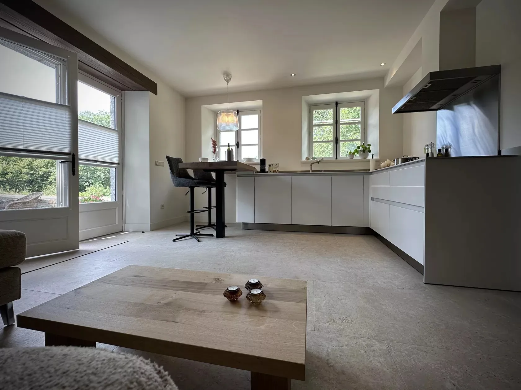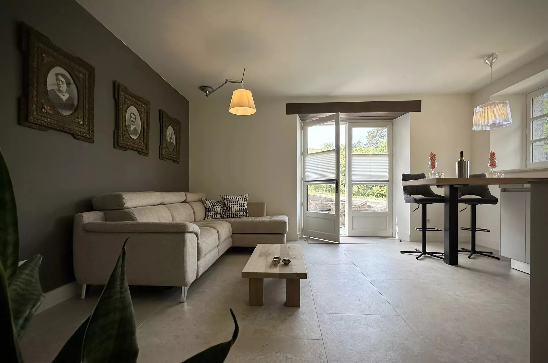 Par la terrasse privée du gîte, vous entrez dans la salle de séjour / cuisine avec tous les équipements. Un canapé d’angle où vous pouvez vous détendre et une table de bar avec des tabourets confortables.