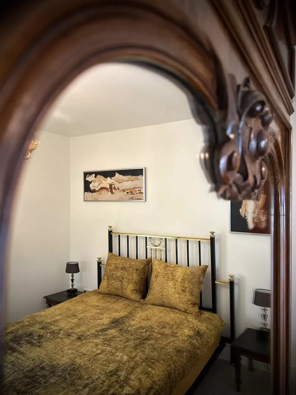 La chambre à coucher est adjacente au salon et peut être fermée par des rideaux coulissants japonais. La chambre dispose d’un lit double de 160 x 200 cm et d’une armoire ancienne.